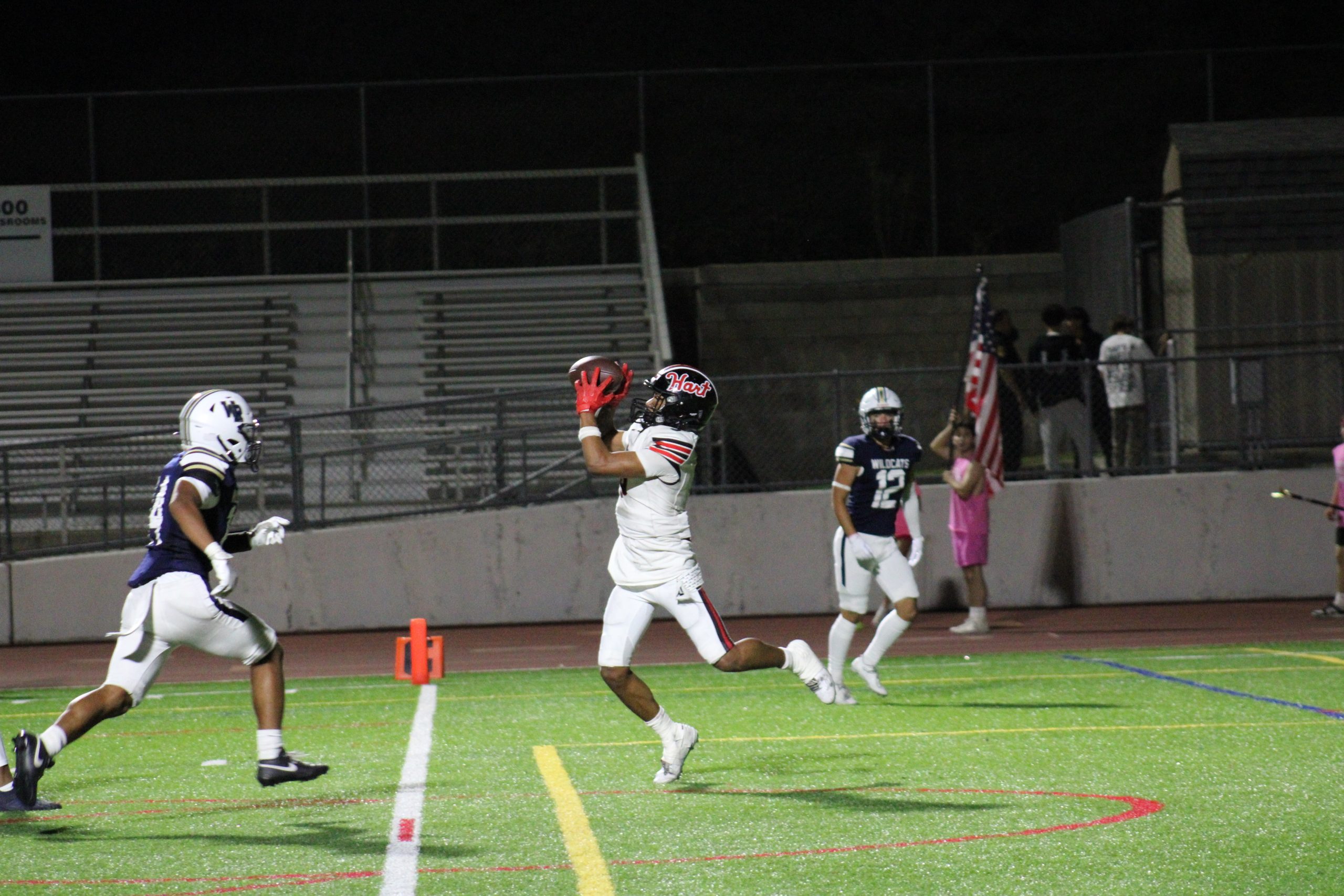 A Hart High School football player in a white uniform leaps to catch a pass during a night game against West Ranch, as a Wildcats defender closes in. The play takes place near the end zone with empty bleachers in the background.
