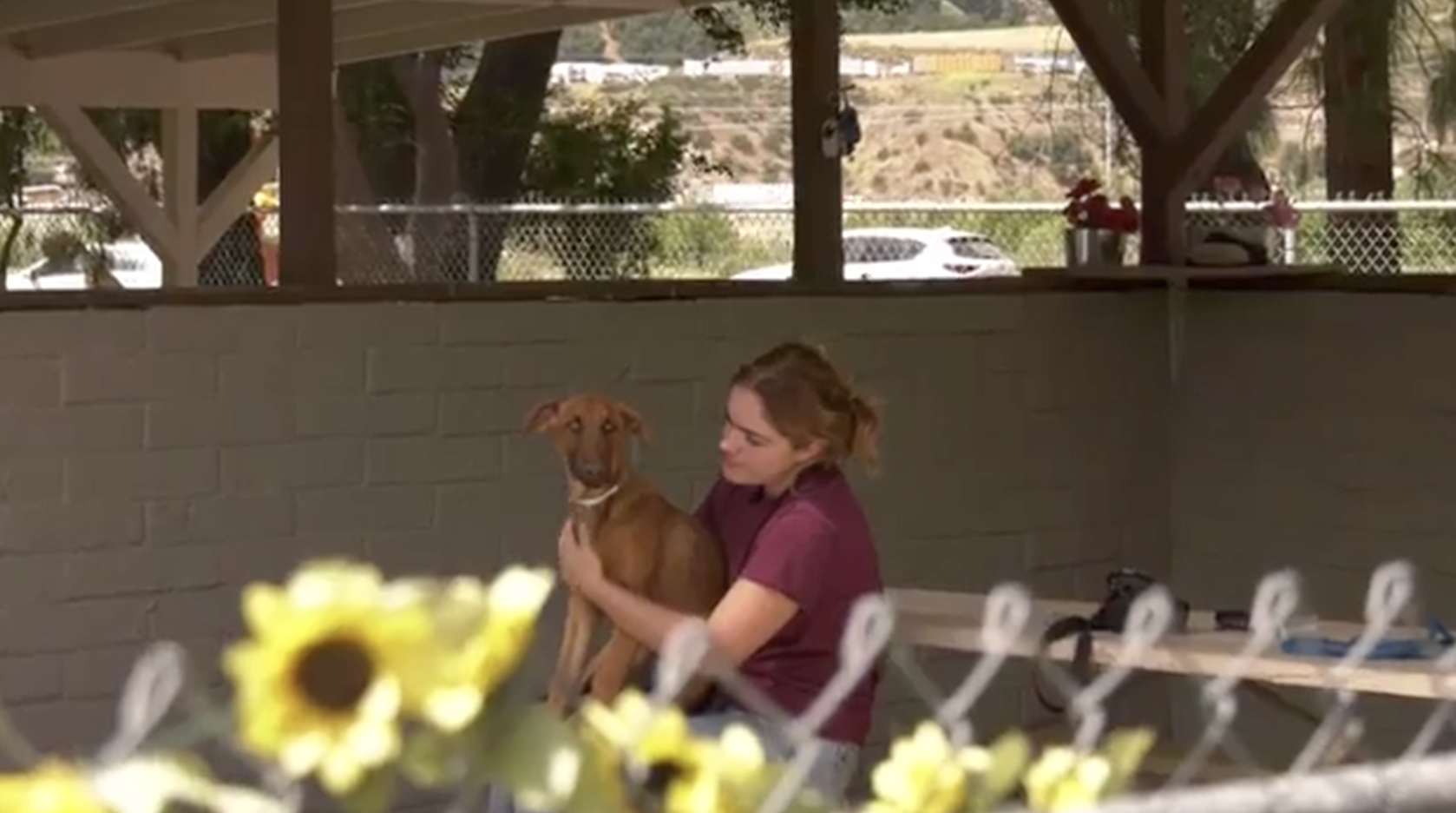 A person sits in a shaded outdoor kennel area, gently holding a brown dog on their lap. A chain-link fence and sunflowers are visible in the foreground, with a hillside and parked cars in the background.